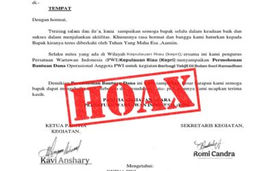 BATAM (GTV)— Proposal permohonan bantuan dana yang mengatasnamakan pengurus Persatuan Wartawan Indonesia (PWI) Provinsi Kepulauan Riau dilaporkan beredar di tengah masyarakat. Dokumen tersebut dipastikan palsu dan tidak pernah diterbitkan oleh organisasi resmi. Ketua PWI Kepri, Saibansah Dardani, menegaskan bahwa pihaknya tidak pernah mengeluarkan proposal permohonan dana untuk kegiatan berbagi takjil selama Ramadan. “Proposal itu bodong….
