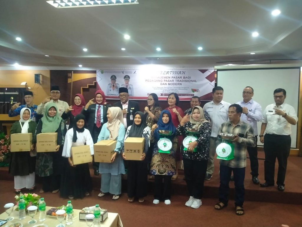 Walikota Lis Darmansyah menyerahkan secara simbolis alat Timbangan kepada wakil pedagang pasar tradisional maupun pasar modern.